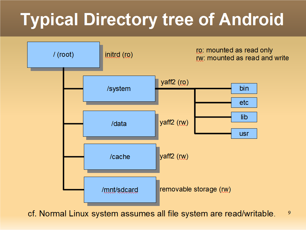 $ df df Filesystem Size Used Free Blksize /dev 199M 76K 199M 4096 /mnt/asec 199M 0K 199M 4096 /mnt/obb 199M 0K 199M 4096 /system 312M 223M 88M 4096 /data 380M 155M 224M 4096 /cache 225M 2M 222M 4096 /data/idd 10M 1M 8M 4096 /mnt/sdcard 14G 1G 13G 16384 /mnt/secure/asec: Permission denied $ mount mount rootfs / rootfs ro,relatime 0 0 tmpfs /dev tmpfs rw,relatime,mode=755 0 0 devpts /dev/pts devpts rw,relatime,mode=600 0 0 proc /proc proc rw,relatime 0 0 sysfs /sys sysfs rw,relatime 0 0 tmpfs /mnt/asec tmpfs rw,relatime,mode=755,gid=1000 0 0 tmpfs /mnt/obb tmpfs rw,relatime,mode=755,gid=1000 0 0 /dev/block/mtdblock0 /system yaffs2 ro,relatime 0 0 /dev/block/mtdblock3 /data yaffs2 rw,nosuid,nodev,relatime 0 0 /dev/block/mtdblock2 /cache yaffs2 rw,nosuid,nodev,relatime 0 0 /sys/kernel/debug /sys/kernel/debug debugfs rw,relatime 0 0 /dev/block/mtdblock1 /data/idd yaffs2 rw,nosuid,nodev,relatime 0 0 /dev/block/vold/179:1 /mnt/sdcard vfat rw,dirsync,nosuid,nodev,noexec,relatime,u id=1000,gid=1015,fmask=0702,dmask=0702,allow_utime=0020,codepage=cp437,iocharset =iso8859-1,shortname=mixed,utf8,errors=remount-ro 0 0 /dev/block/vold/179:1 /mnt/secure/asec vfat rw,dirsync,nosuid,nodev,noexec,relat ime,uid=1000,gid=1015,fmask=0702,dmask=0702,allow_utime=0020,codepage=cp437,ioch arset=iso8859-1,shortname=mixed,utf8,errors=remount-ro 0 0 tmpfs /mnt/sdcard/.android_secure tmpfs ro,relatime,size=0k,mode=000 0 0 $ cat /proc/mtd cat /proc/mtd dev: size erasesize name mtd0: 13880000 00020000 "system" mtd1: 00a00000 00020000 "appslog" mtd2: 0e100000 00020000 "cache" mtd3: 17c00000 00020000 "userdata" $