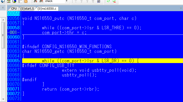 その上にある NS16550_putc はシリアルインターフェイスにデータを送信する関数です。ここにブレークポイントを設定してみましょう。