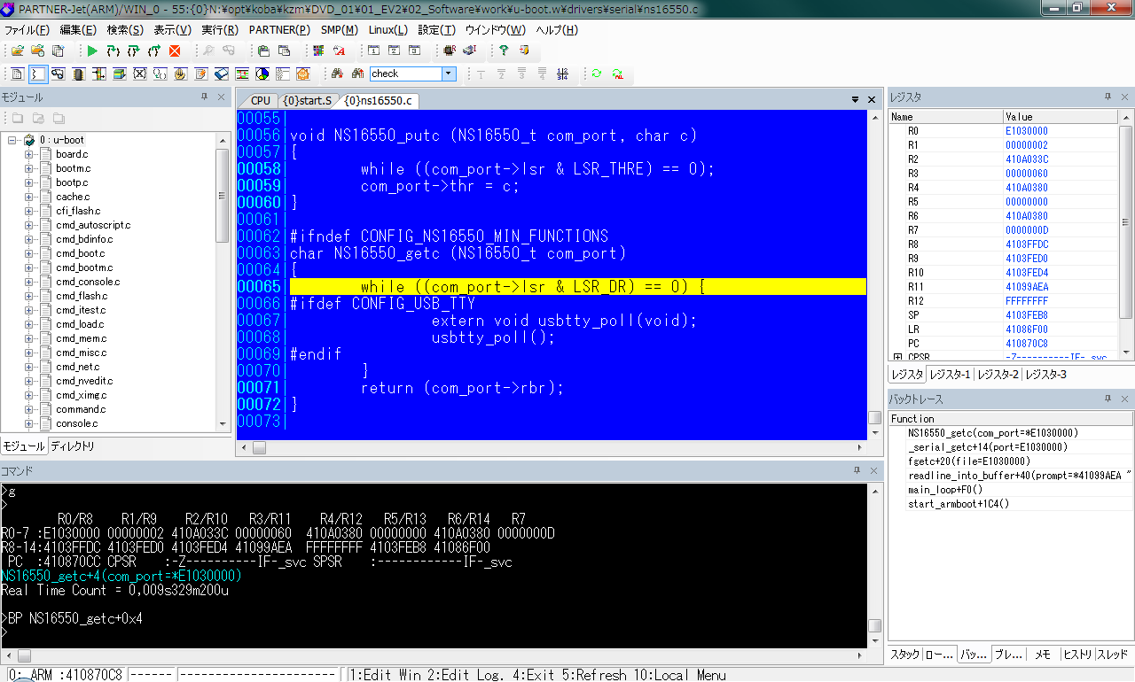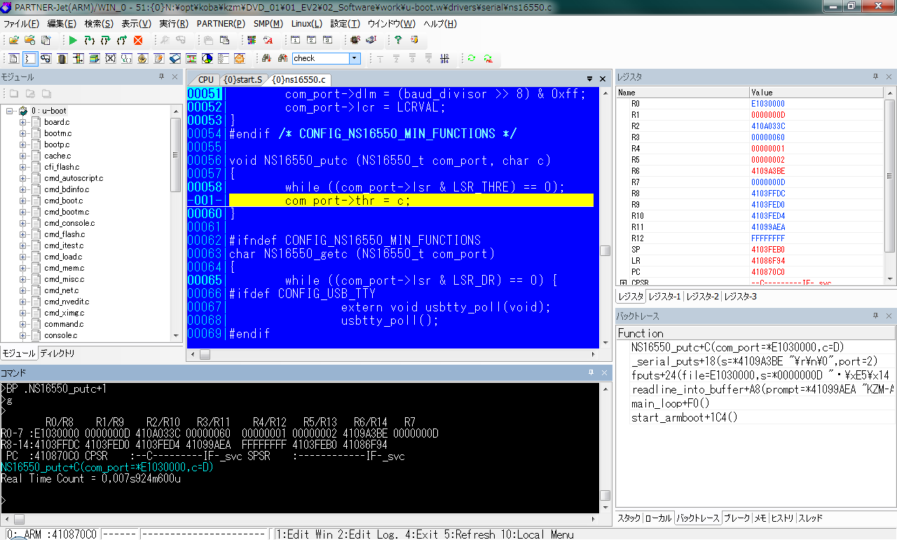 NS16550_putc のところでブレークします。
